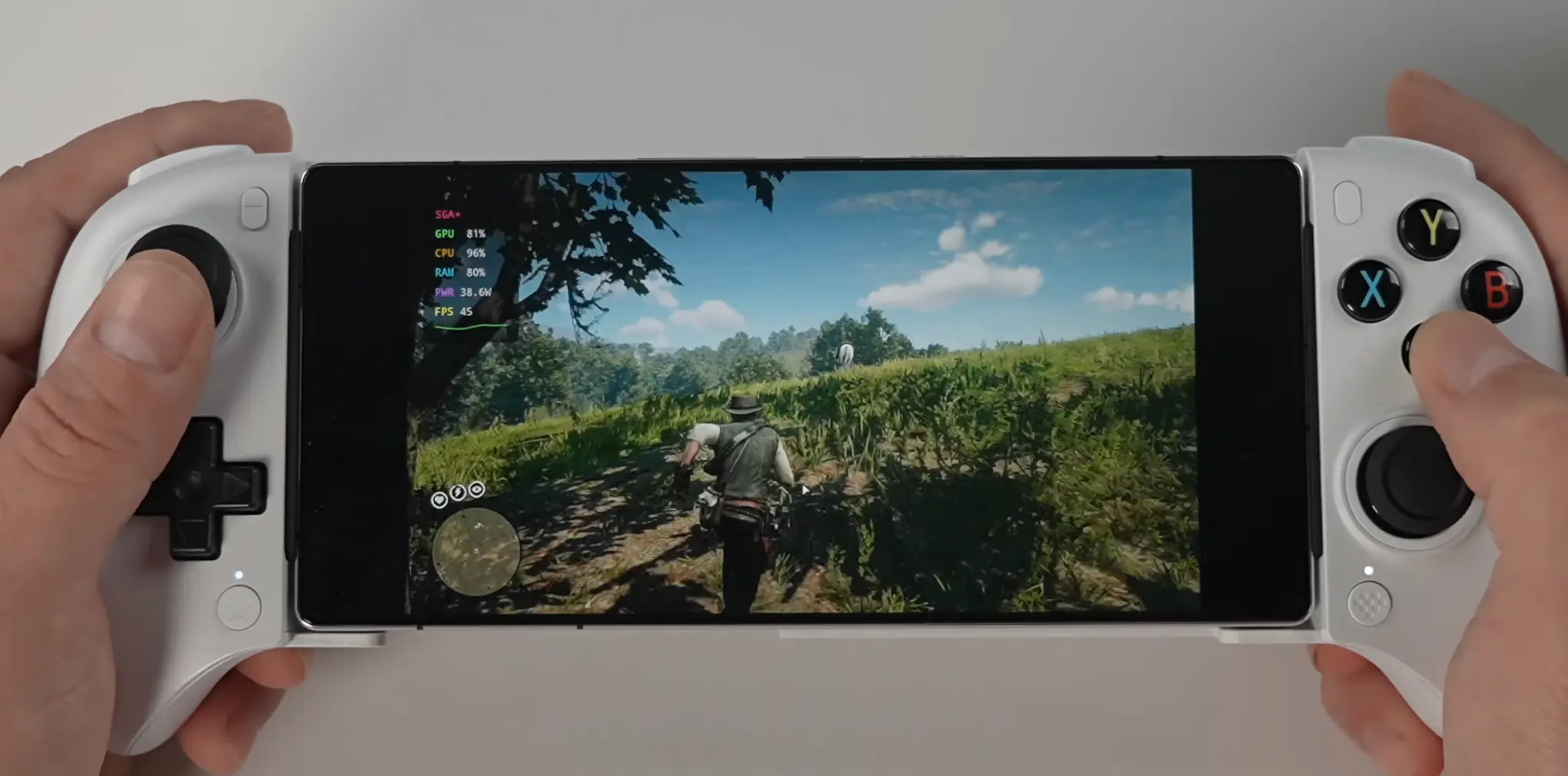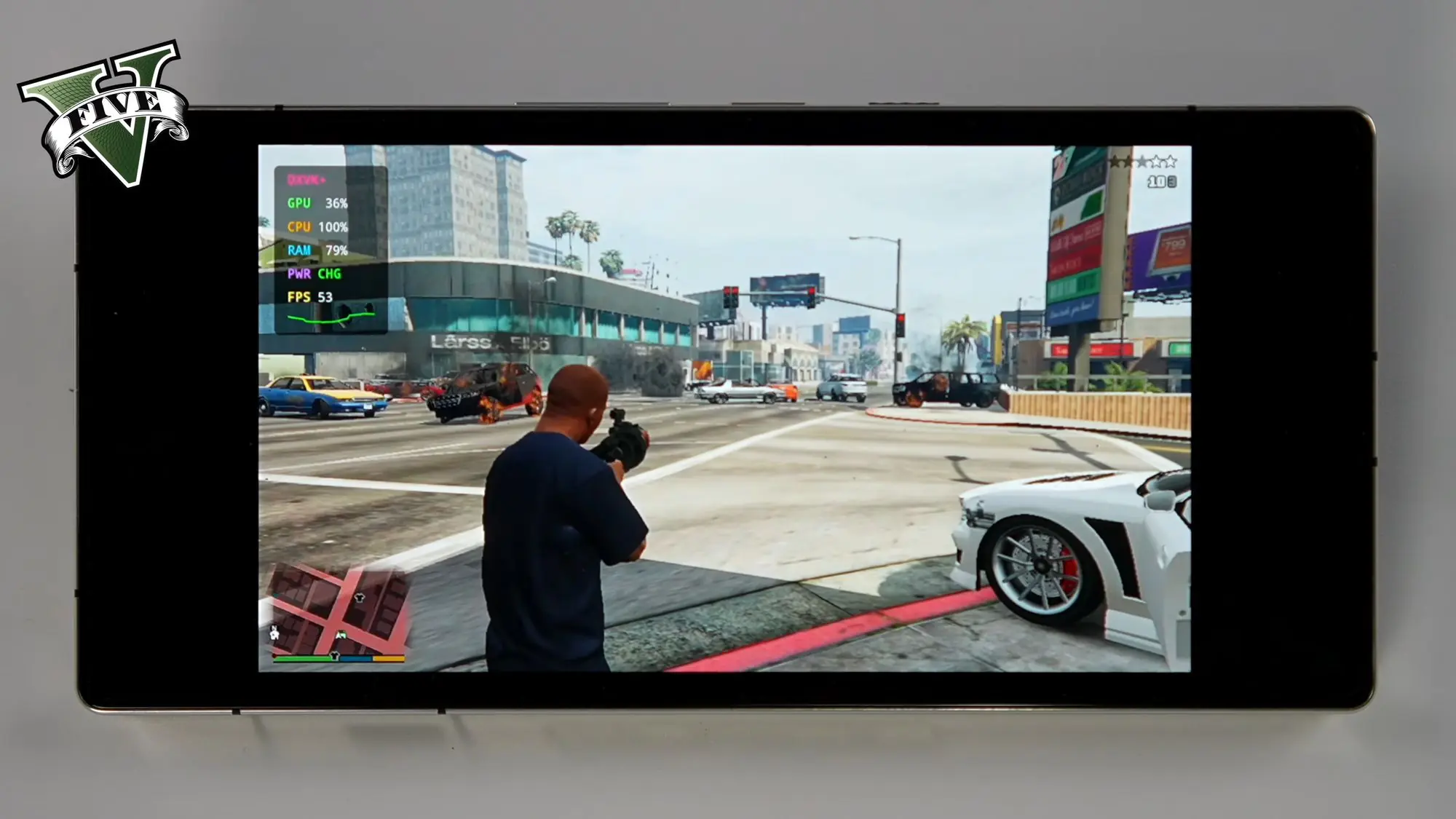 Grand Theft Auto Vは720p設定で屋内最大100FPS、市街地走行時でも60FPS台半ばを維持した。2013年発売のタイトルとはいえ、スマートフォン上のエミュレーションでこの数字が出ること自体が異例だ。