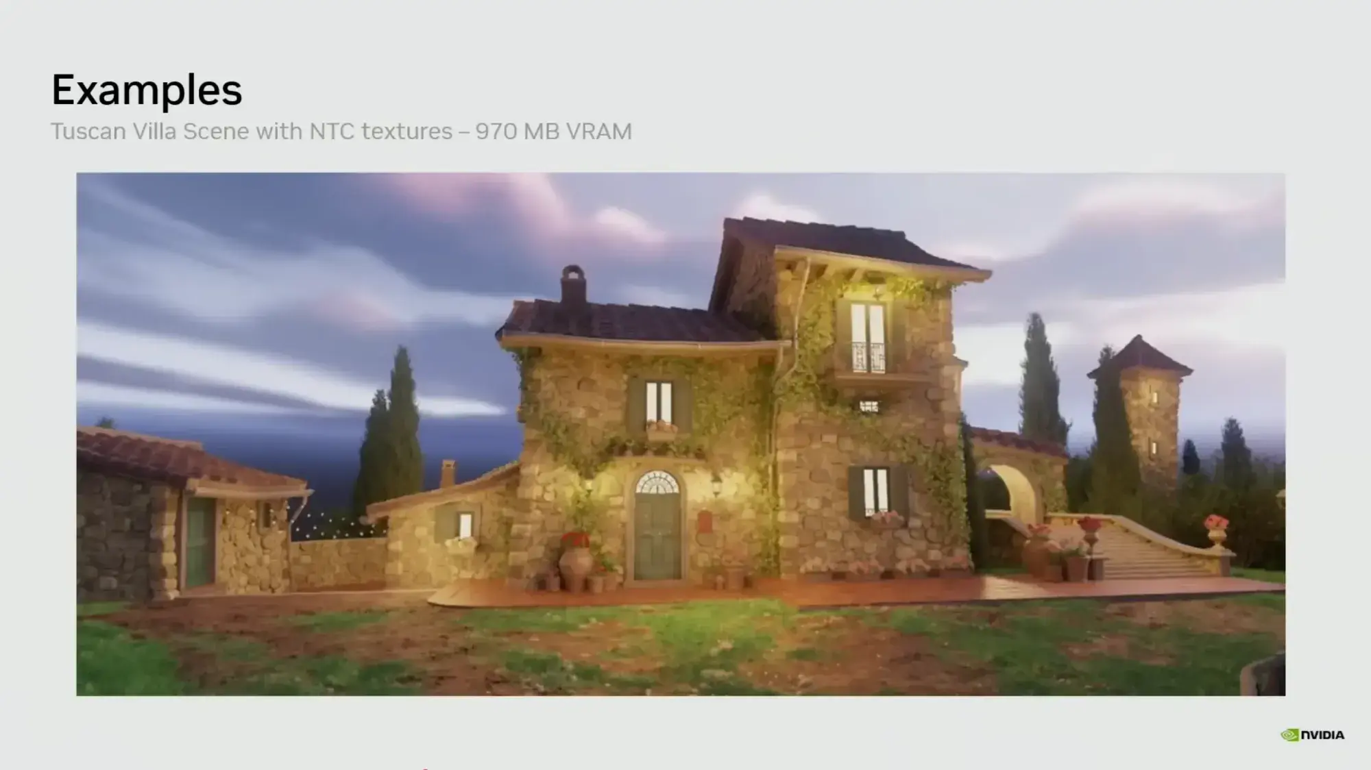 トスカーナの別荘を描いたシーンで、従来のBCn圧縮テクスチャが6.5GBのVRAMを消費するのに対し、NTC適用後はわずか970MBまで縮小された。画質をほぼ維持したまま、VRAM消費が約85%減少するという数字は、8GBカードのユーザーにとって別世界の話に聞こえる。