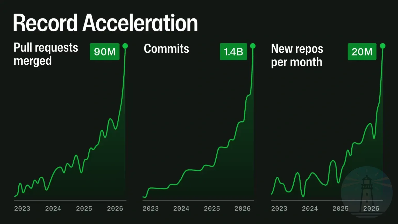 GitHubが本文中で公開しているグラフでは、月あたりプルリクエスト9,000万件、コミット14億件、新規リポジトリ2,000万件といった数字が示されている。2023年から2025年までは緩やかな立ち上がりだったが、2025年後半から急峻な指数曲線に変わっている。