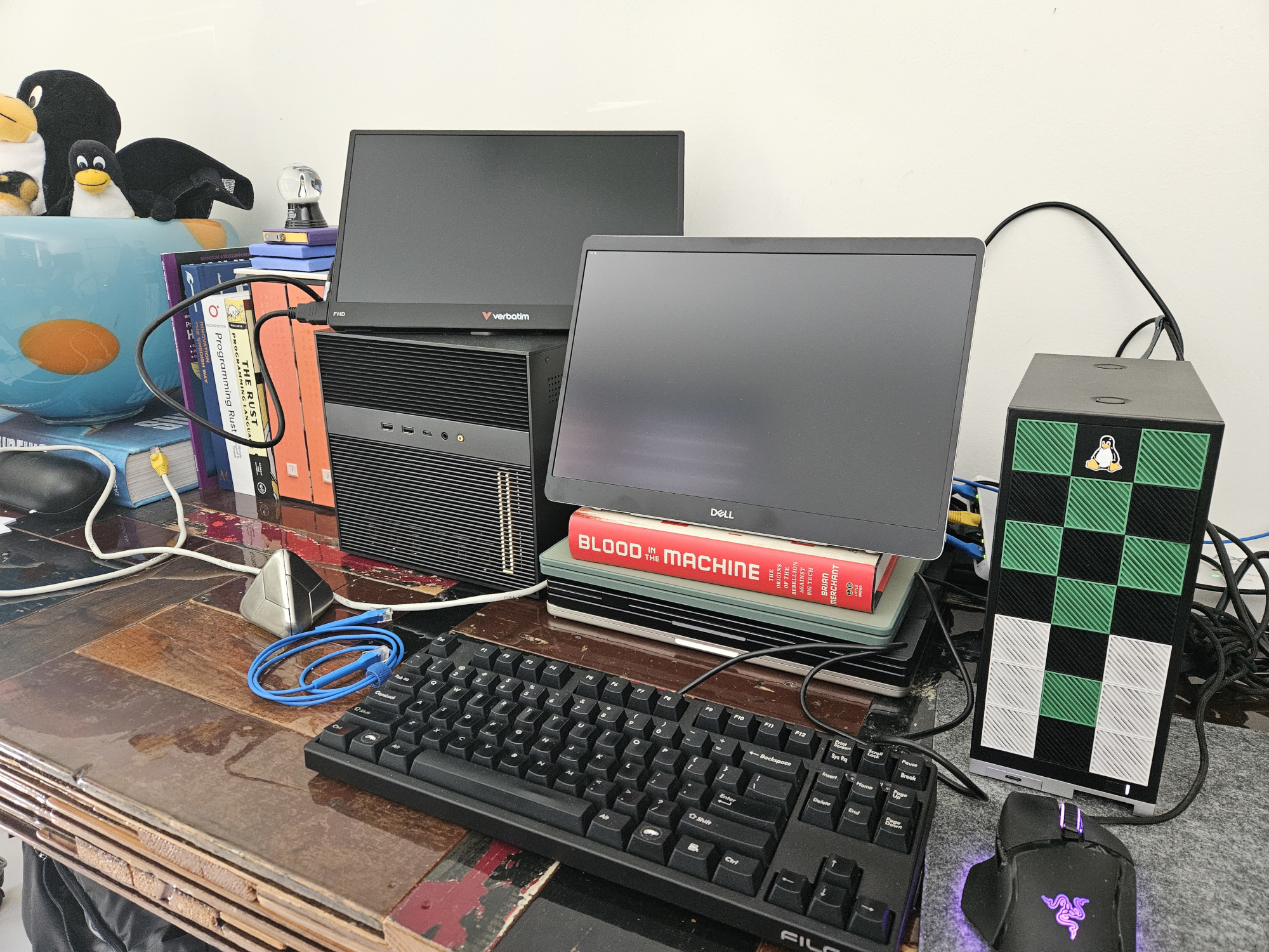 写真を見る限り、机の上はやや雑然としていて、Framework Desktopの隣にはペンギンの人形やモニター、小型のテストボードらしきものが並んでいる。世界中のLinuxサーバを支える人物の作業環境としては、拍子抜けするほど普通だ。