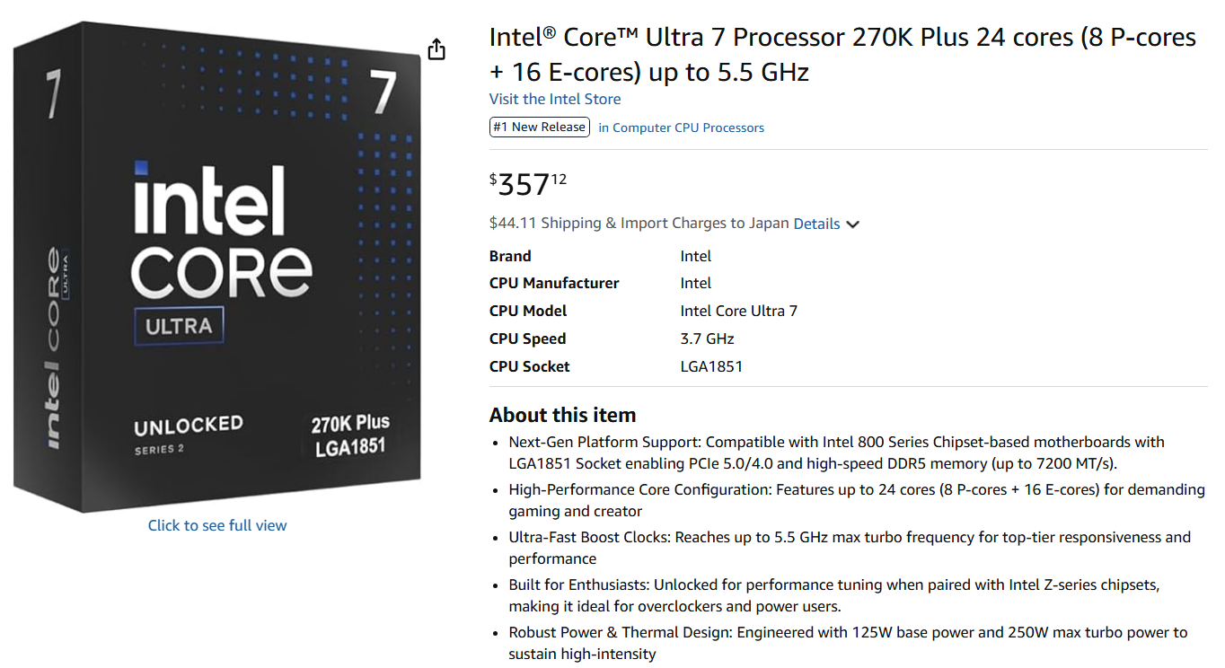 Core Ultra 7 270K PlusはNeweggで349ドル、Amazonでは357ドル。299ドルで買える場所は、現時点で存在しない。