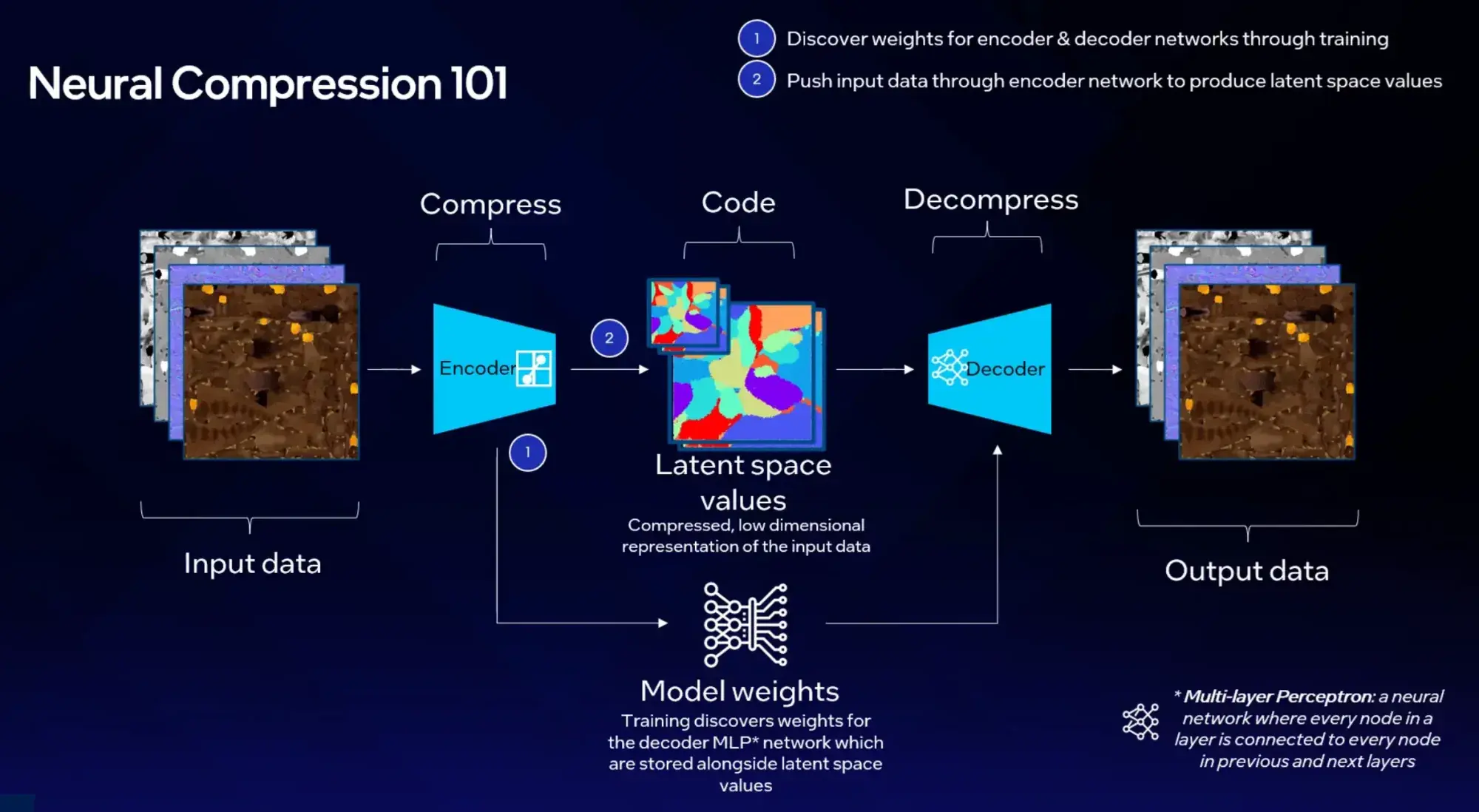 MLP(多層パーセプトロン)は、すべてのノードが前後の層と全結合したニューラルネットワークだ。TSNCでは、このMLPがテクスチャごとに最適化された「辞書」として機能し、圧縮された潜在コードから元のピクセル値を復元する。