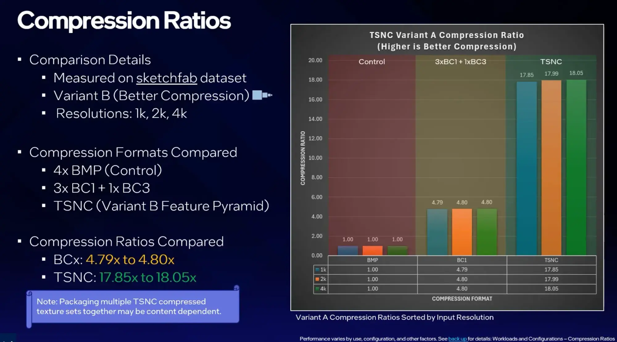 注目すべきは圧縮率の数字だ。Intelの自社テストによれば、従来のBCブロック圧縮がビットマップ比で約4.8倍の圧縮率にとどまるのに対し、TSNCのVariant Aは9倍以上、Variant Bは18倍以上の圧縮を達成している。同じテクスチャが5分の1以下に縮む。