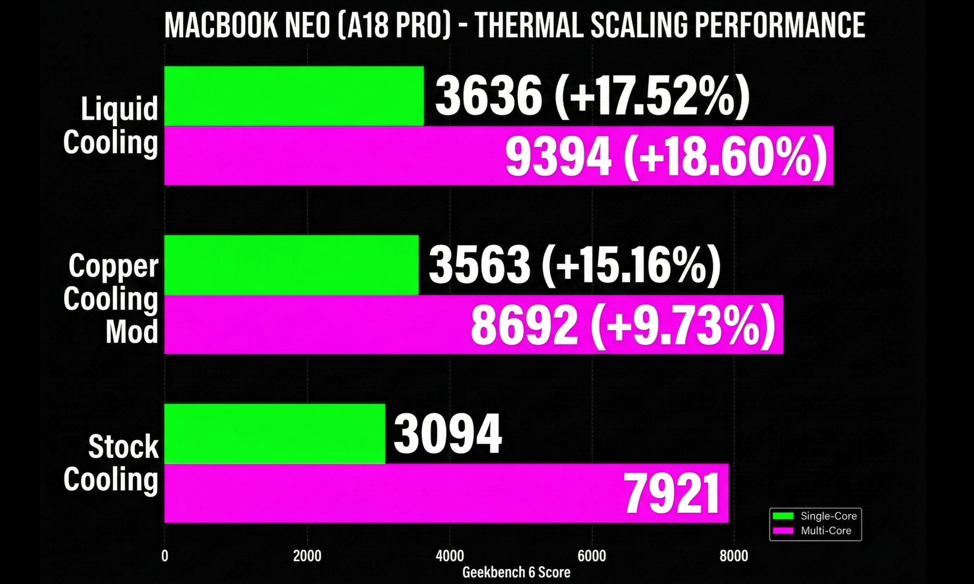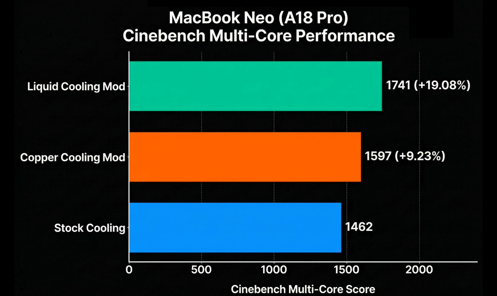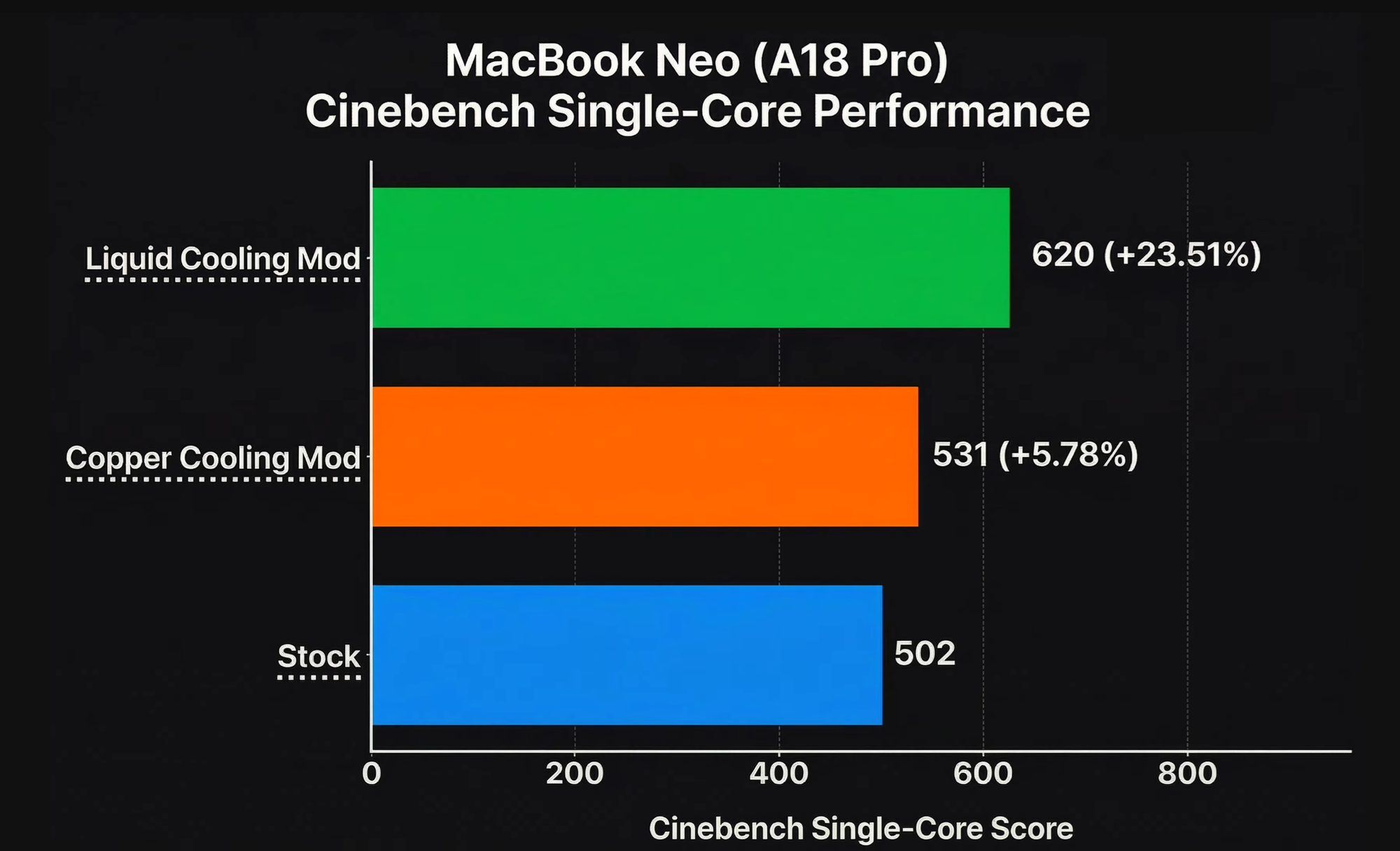 銅板改造だけでもゲーミング性能はほぼ倍増し、液冷まで投入すればベンチマーク全体が2割近く向上する。逆に言えば、ストック状態のMacBook Neoは、自らの性能の約2割を熱で捨てていることになる。