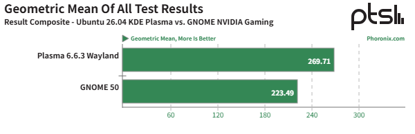 KDE Plasma 6.6.3(Wayland)が269.71に対し、GNOME 50は223.49。数値が大きいほど高性能を示す指標で、差は約21%にのぼる。AMD Radeonテストと同じパターンが、NVIDIAでも繰り返された形だ。