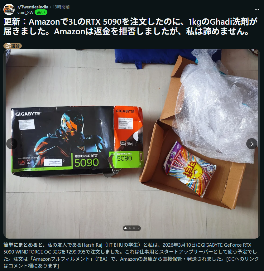 RTX 5090を約52万円で購入、届いたのは約300円の洗濯洗剤――Amazonは返金を拒否した