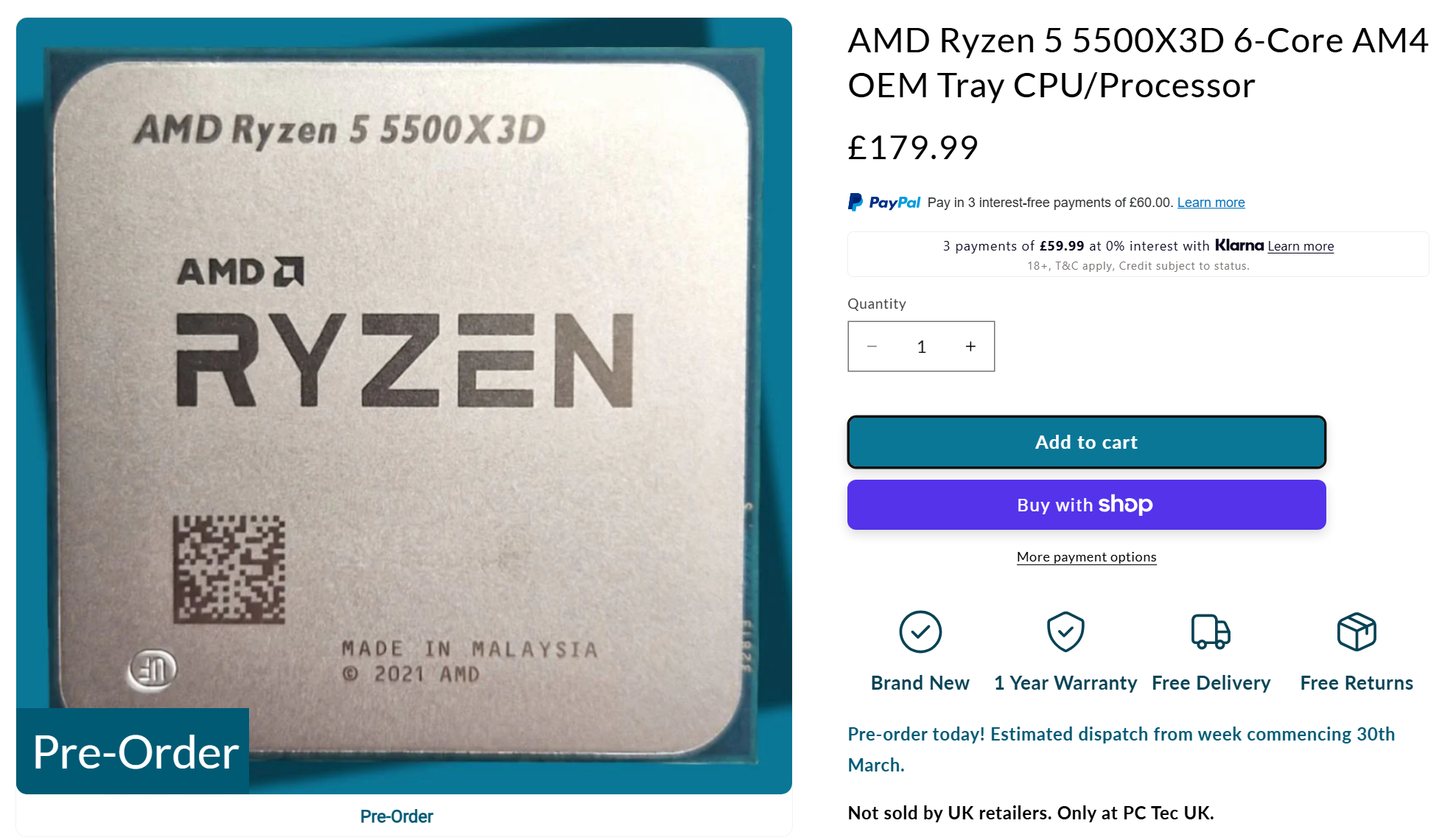 英国のCPU専門リテーラーPC Tecが、AMD Ryzen 5 5500X3DのOEMトレイ版を179.99ポンド(約3万8,300円)で掲載している。出荷予定は3月30日の週からとされているが、掲載と同時にステータスは「sold out」に変わった。