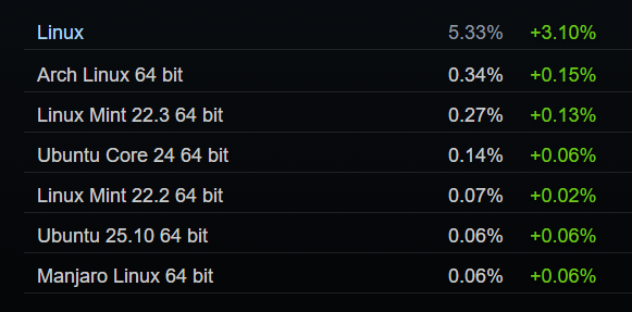 Valveが公開した2026年3月のSteam Hardware & Software Surveyで、Linuxのマーケットシェアが5.33%を記録した。前月比で3.10ポイントの急上昇であり、Steamの歴史上、Linuxが5%の壁を超えたのはこれが初めてだ。