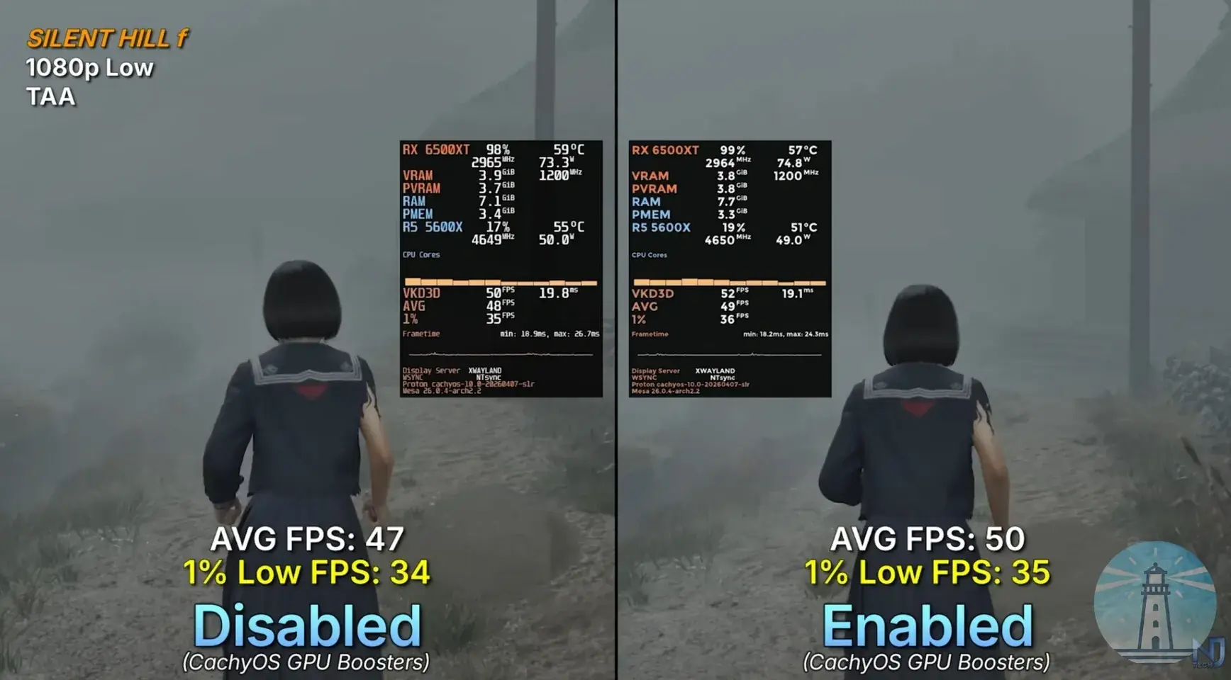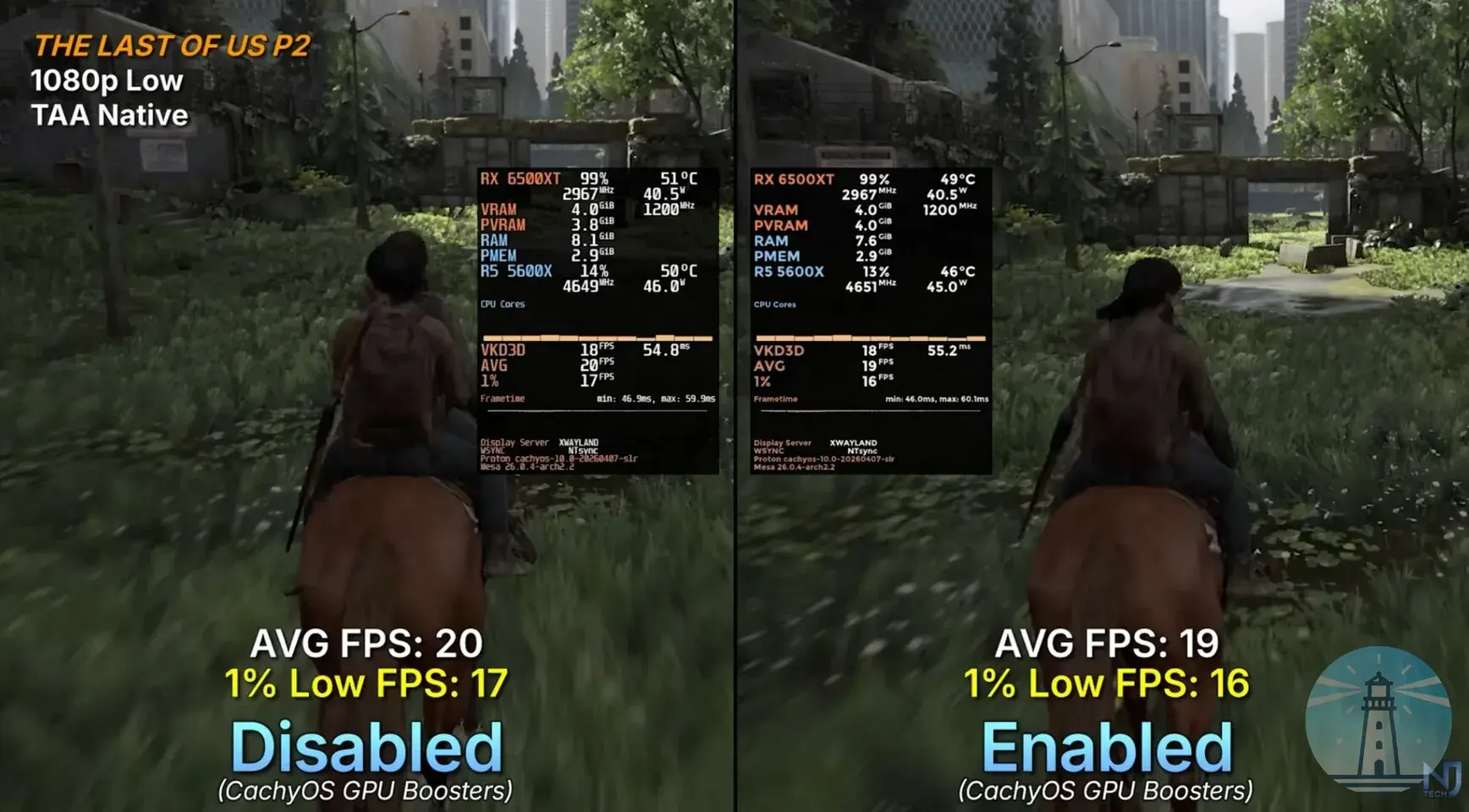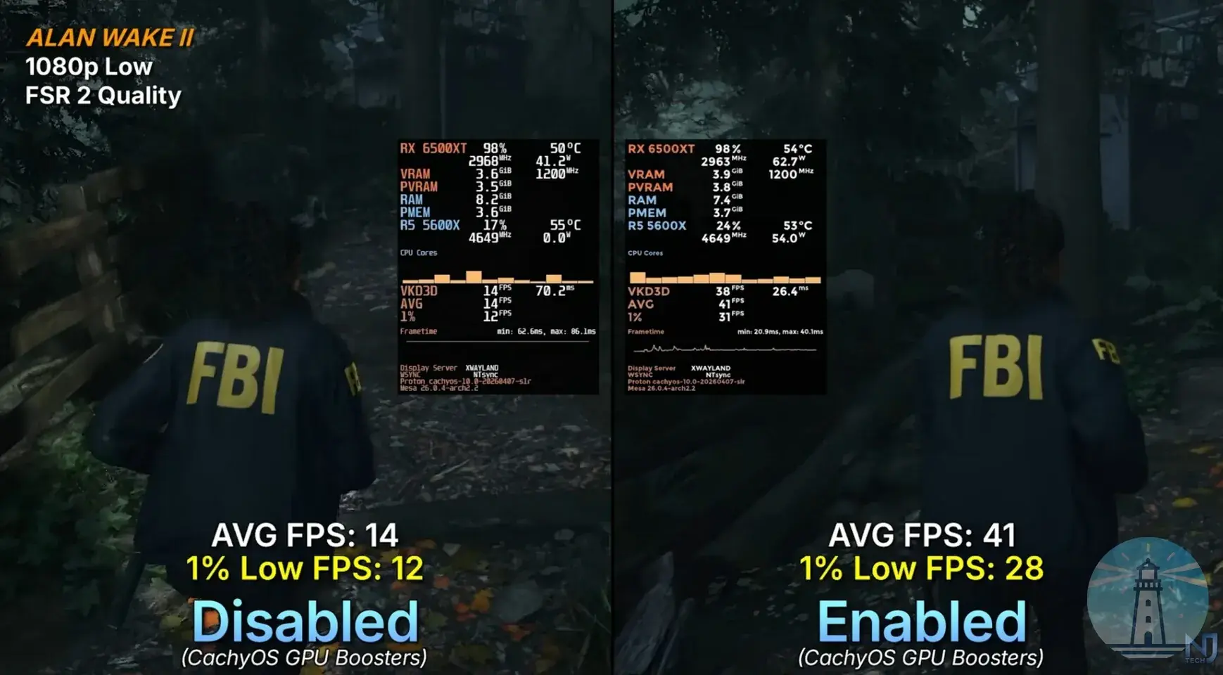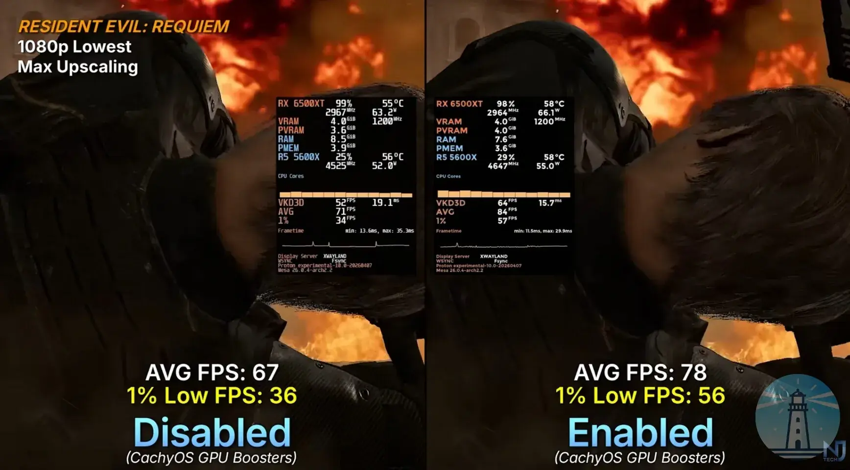 そこに現れたのがNJ Techのベンチマークだ。テスト機はRyzen 5 5600X(定格)、DDR4 16GB、そしてGPUはRadeon RX 6500 XT。CachyOSを使い、インストーラの「Install GPU Boosters」オプションから有効化している。4GBは8GBより厳しい条件であり、この検証の意味はパッチの本質を問い直すものになった。