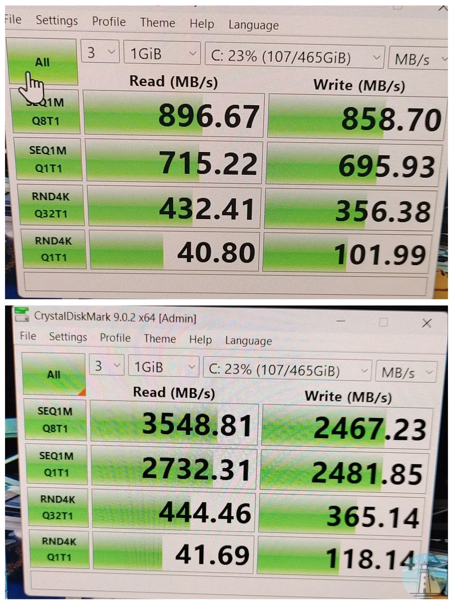 2枚目は、Read 3548.81 MB/s、Write 2467.23 MB/s。