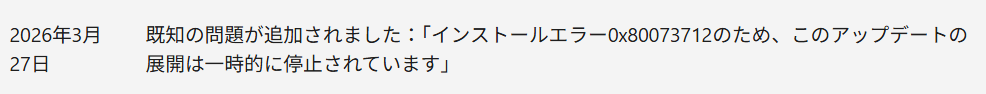 Windows 11向けのプレビュー更新プログラムKB5079391が、配信開始からわずか1日で撤回されている。対象はバージョン24H2と25H2の両方。3月26日にリリースされたこのアップデートは、インストール時にエラーコード「0x80073712」を引き起こし、Microsoftは3月27日付でサポートページの変更ログに既知の問題として追記した。