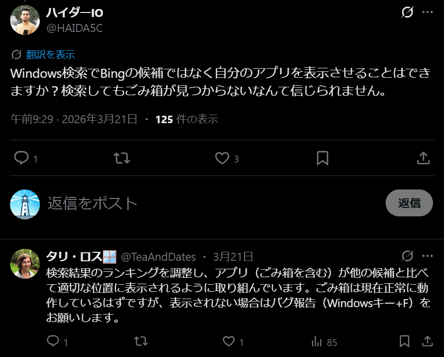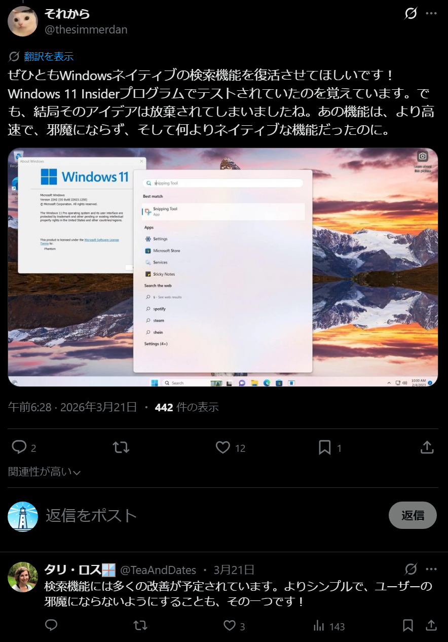 それに応答したのが、Windowsシェル体験を統括するプロダクト責任者、タリ・ロスだ。彼女はユーザーの投稿に直接返信する形で、検索の改善を明言した。